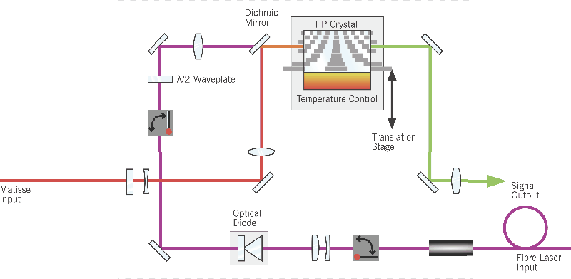 MixTrain is an advanced stand-alone device that enables sum or difference frequency mixing of single frequency CW laser beams in periodically polled crystals. High mixing efficiencies are achieved by precision temperature control to ensure optimal quasi-phase matching over the entire tuning range of the Matisse®. When combined with a high power fiber laser, sum frequency output exceeding 2 W is readily achieved.