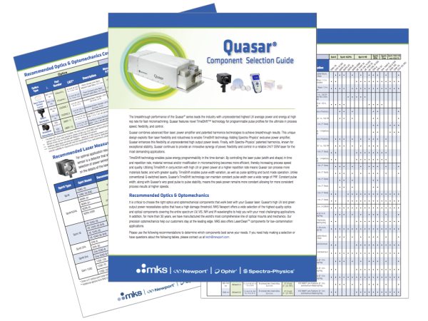 It is critical to choose the right optics and optomechanical components that work best with your Quasar laser. Quasar’s high UV and green output power necessitates optics that have a high damage threshold. MKS Newport offers a wide selection of the highest quality optics and optical components covering the entire spectrum UV, VIS, NIR and IR wavelengths to help you with your most challenging applications.